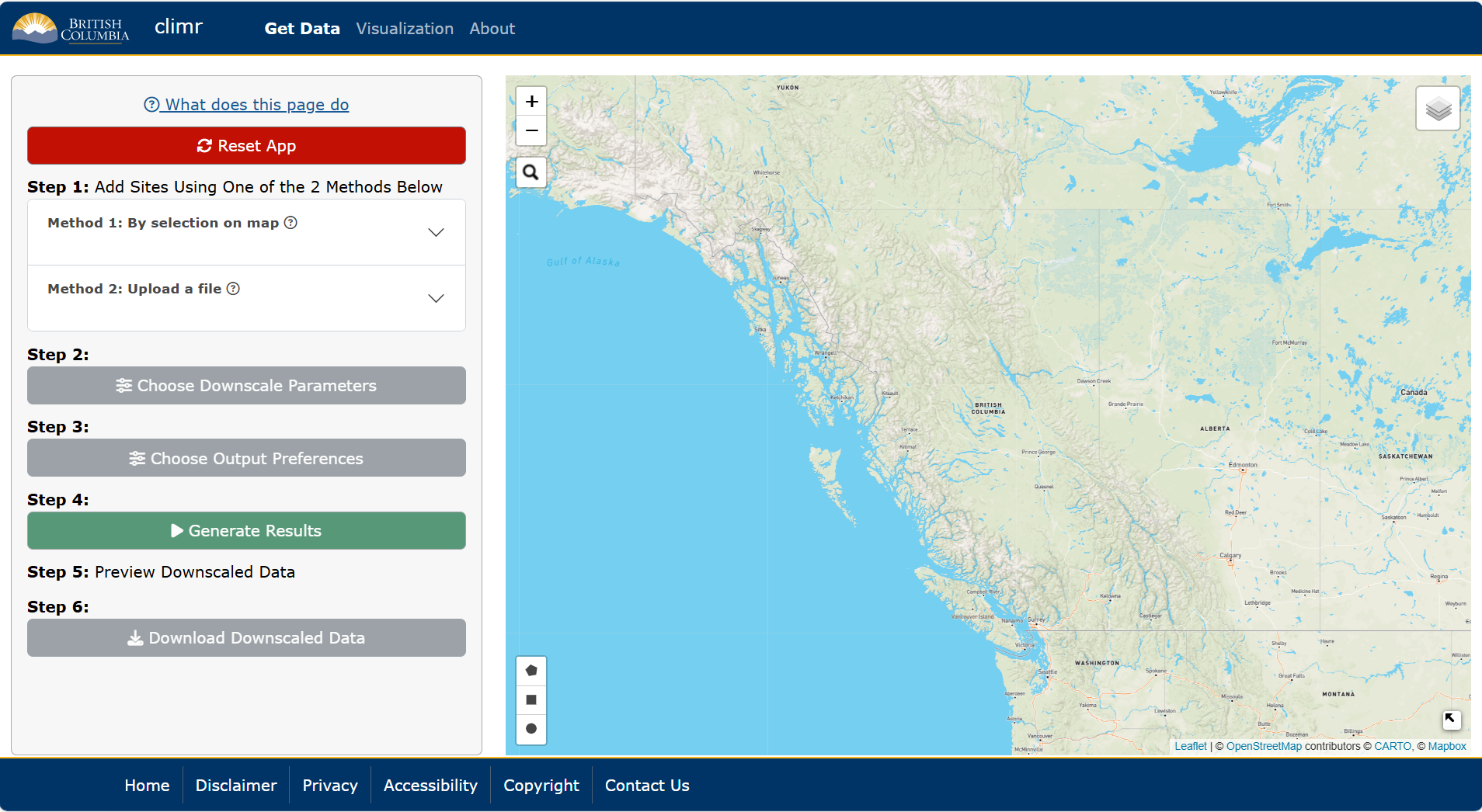 In the first tab of the climr app, users can select points or areas of interest, choose parameters, downscale the data, and preview and download the data. For a very quick summary of functionality of this page, users can also click the What does this page do link at the top of the left-hand panel. Throughout the app, there are also blue underlined phrases. Click on these hyperlinks to be brought to the relevant help pages.