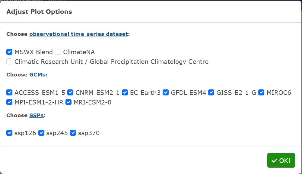 To adjust the plot parameters from the recommended defaults, click on the Adjust Plot button, select the observational dataset(s), GCM(s) and SSP(s), and click OK! (Figure 3.18).